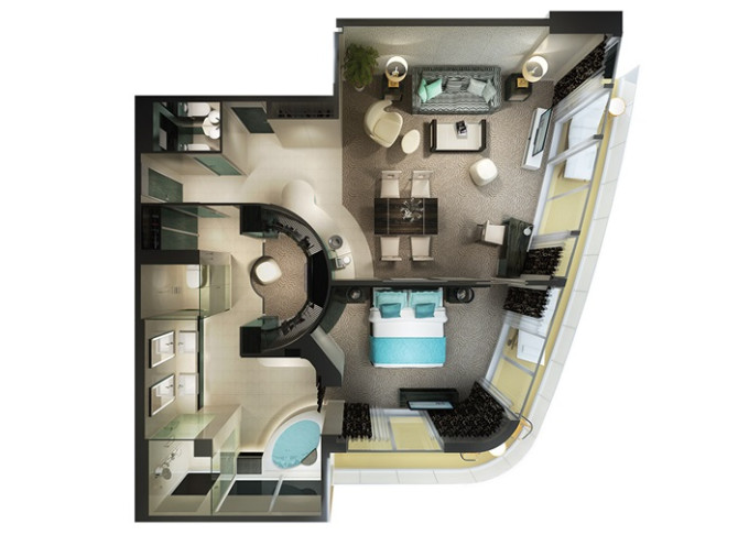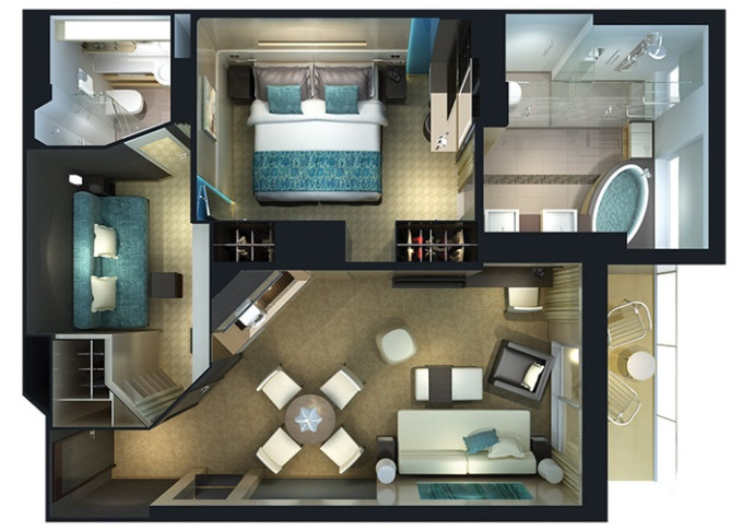 | H3 - The Haven Deluxe Owner's Suite 53 m² / balkón 9 m². 16. paluba - vpredu. Max 4 osoby. Výhody The Haven. | 11 198 € 5 599 € za osobu | ||