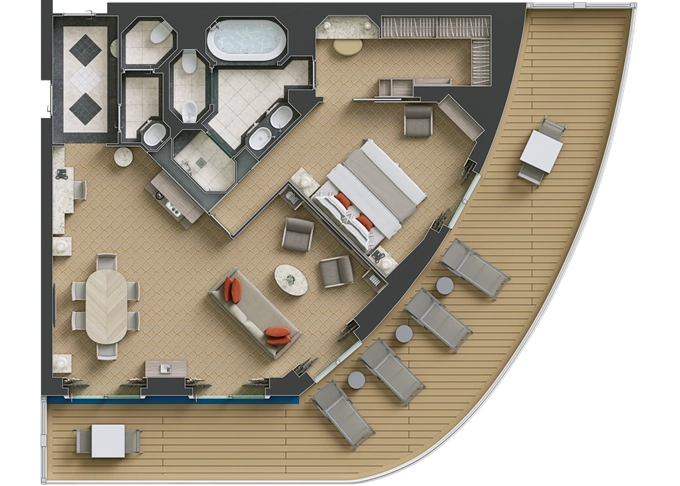 | R1 - Royal Suite 1 105 m² (vrátane balkónu). 7. paluba vpredu. Max 3 osoby. | 24 200 € 24 200 € za osobu | ||