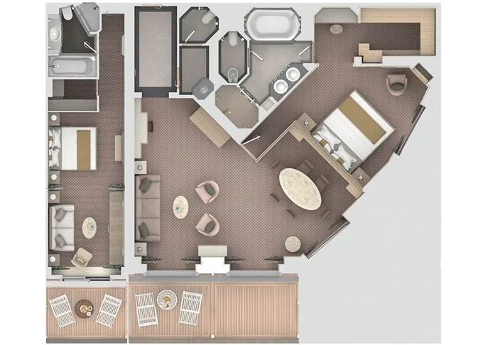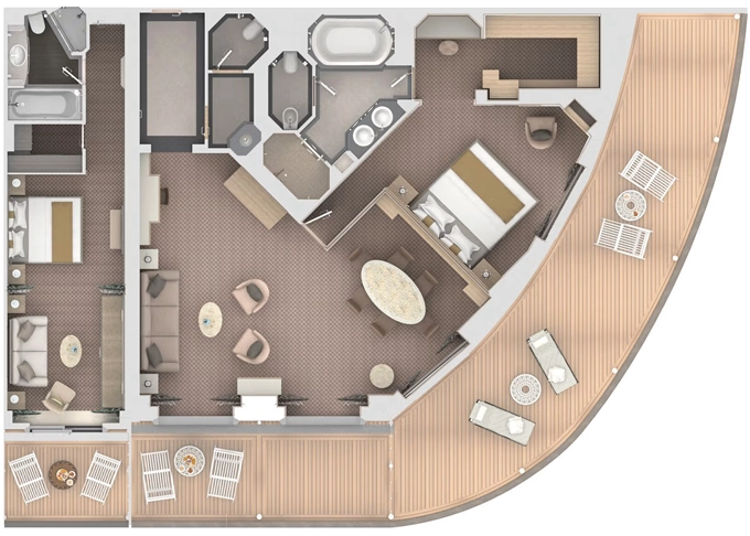| S2 - Silver Suite 2 92 m² + 12 m². Silver Suite SL spojená s Panorama Suite PA. 9,10,11. paluba. Max 5 osôb. | 32 400 € 32 400 € za osobu |