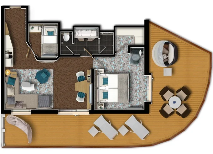 | SUDO - Diamant Suite 42 m² + balkón 47 m² so stolom, hojdacou sieťou, 2 ležadlami a posteľou Sun island. Spálňa (manželská posteľ), obývacia izba (rozkladacia pohovka), 2. spálňa (lôžko a vyklápacia posteľ), hracia konzola. 6. paluba. Max 6 osoby. Výhody Suite. | 5 998 € 5 998 € za osobu | ||