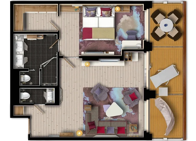| SUTO - Themen Suite 54 m² + balkón 15 m² so stolom, ležadlom a hojdacou sieťou. Spálňa, obývacia časť, šatník. 10. paluba. Max 4 osoby. Výhody Suite. | 20 398 € 20 398 € za osobu |